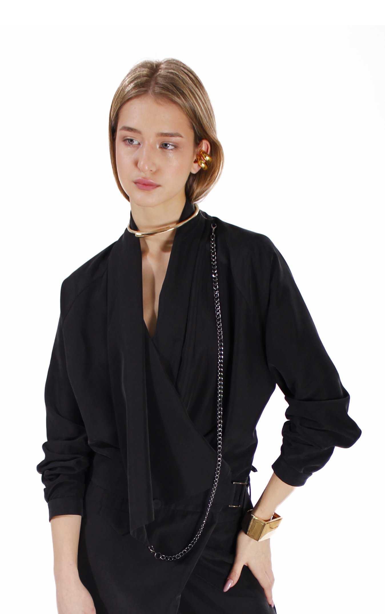 • black stripes masculine jacket • one or two button closure • chest welt pocket • 3 side pockets • back slit • sleeves splits • 4 button cuffs • curved hem • separate belt