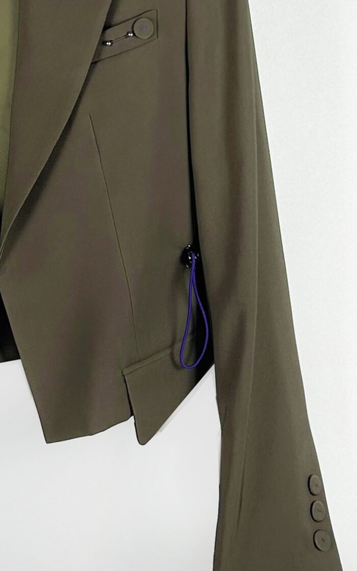 • Rever sa zarezom, metalna igla kao akcenat, bočni rajsferšlus detalji